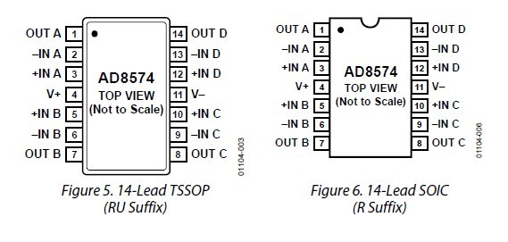 AD8574ARUZ absolute maxing ratings: (1)Supply Voltage: 6V; (2)Input Voltage: GND to VS + 0.3V; (3)Differential Input Voltage: ±5.0V; (4)ESD (Human Body Model): 2000 V; (5)Output Short-Circuit Duration to GND: Indefinite; (6)Storage Temperature Range RM, RU, and R Packages: -65℃ to +150℃; (7)Operating Temperature Range: -40℃ to +125℃; (8)Junction Temperature Range RM, RU, and R Packages: -65℃ to +150℃; (9)Lead Temperature Range (Soldering, 60 sec): 300℃.