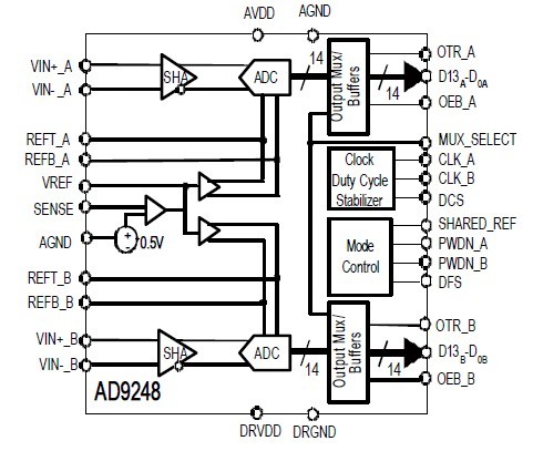 The AD9248BSTZ-65 is a dual, 3V, 14-bit, 20/40/65 MSPS analog-todigital converter. It features dual high performance sample-and hold amplifiers and an integrated voltage reference. The applications of the AD9248BSTZ-65 include: (1)Ultrasound Equipment; (2)IF Sampling in Communications Receivers; (3)IS-95, CDMA One, IMT-2000; (4)Battery-Powered Instruments; (5)Hand-Held Scopemeters; (6)Low Cost Digital Oscilloscopes.