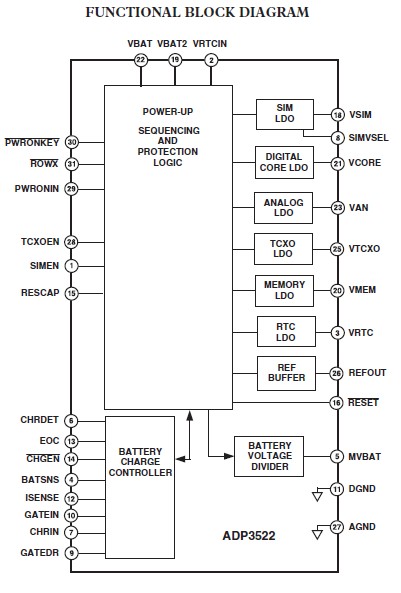 Features: (1)Handles all GSM Baseband Power Management; (2)6 LDOs Optimized for Specific GSM Subsystems; (3)Li-Ion Battery Charge Function; (4)Optimized for the AD20msp430 Baseband Chipset; (5)Reduced Package Size: 5 mm × 5 mm LFCSP-32.