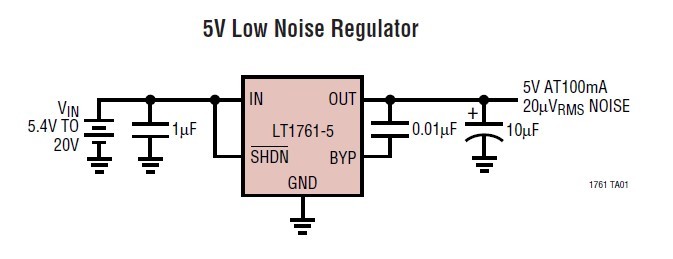 LT1761ES5-1.8 features: (1)Tiny 5-Lead SOT-23 Package; (2)Low Noise: 20μVRMS (10Hz to 100kHz); (3)Low Quiescent Current: 20μA; (4)Wide Input Voltage Range: 1.8V to 20V; (5)Output Current: 100mA; (6)Very Low Shutdown Current: < 0.1μA; (7)Low Dropout Voltage: 300mV at 100mA; (8)Fixed Output Voltages: 1.5V, 1.8V, 2V, 2.5V, 2.8V, 3V, 3.3V, 5V.