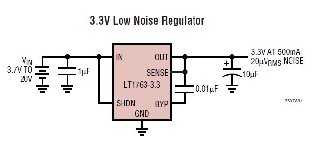 LT1763CS8 features: (1)Low Noise: 20μVRMS (10Hz to 100kHz); (2)Output Current: 500mA; (3)Low Quiescent Current: 30μA; (4)Wide Input Voltage Range: 1.8V to 20V; (5)Low Dropout Voltage: 300mV; (6)Very Low Shutdown Current: < 1μA; (7)No Protection Diodes Needed; (8)Fixed Output Voltages: 1.5V, 1.8V, 2.5V, 3V, 3.3V, 5V.