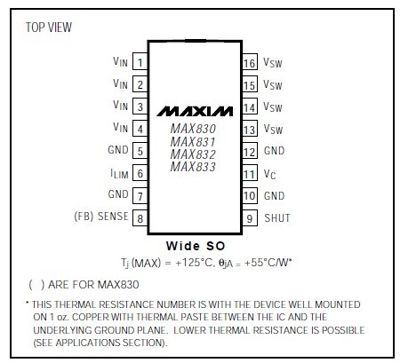 MAX830CWE absolute maximum ratings: (1)Input Voltage: 40V; (2)Switch Voltage with Respect to Input Voltage: 50V; (3)Switch Voltage with Respect to GND (VSW negative): 20V; (4)FB/SENSE Voltage: -0.3V, +10V; (5)SHUT Voltage (not to exceed VIN): 30V; (6)ILIM Voltage (forced): 5.5V; (7)Operating Temperature Range: 0℃ to +70℃; (8)Junction Temperature Range: 0℃ to +125℃; (9)Storage Temperature Range: -65℃ to +160℃; (10)Lead Temperature (soldering, 10sec): +300℃.