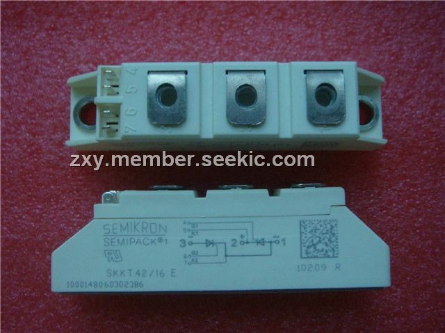 SKKT42/16E features: (1)heat transfer and isolation through aluminium oxide ceramic isolated metal baseplate; (2)hard soldered joints for high reliability; (3)UL recognized, file no. E 63 532.